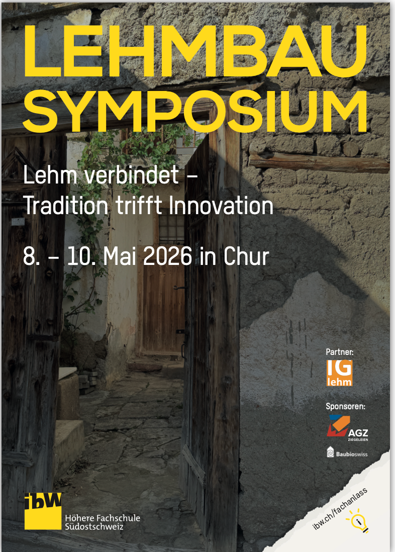 Vom 8. - 10. Mai 2026 findet an der ibW Höhere Fachschule Südostschweiz in Chur das 2. Lehmbau-Symposium „Lehm verbindet – Tradition trifft Innovation“ statt. Nach der erfolgreichen Austragung 2023 lädt das Symposium erneut zu einem interdisziplinären Austausch über das Bauen mit Lehm als nachhaltigem und traditionellem Baustoff ein. Ziel der Veranstaltung ist es, den Dialog zwischen Forschung, Praxis und Baukultur zu fördern, innovative Ansätze zu präsentieren und die vielseitige Rolle von Lehm im Bauwesen zu erforschen.