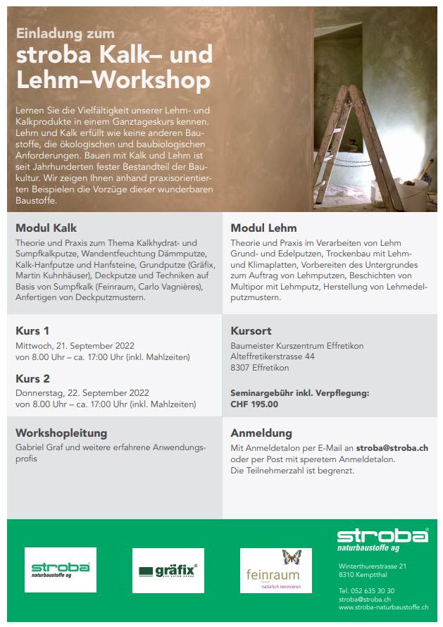 Theorie und Praxis zum Thema Kalkhydrat- und Sumpfkalkputze, Wandentfeuchtung, Dämmputze, Kalk-Hanfputze und Hanfsteine, Grundputze (Gräfix, Martin Kuhnhäuser), Deckputze und Techniken auf Basis von Sumpfkalk (Feinraum, Carlo Vagnières), Anfertigen von Deckputzmustern.