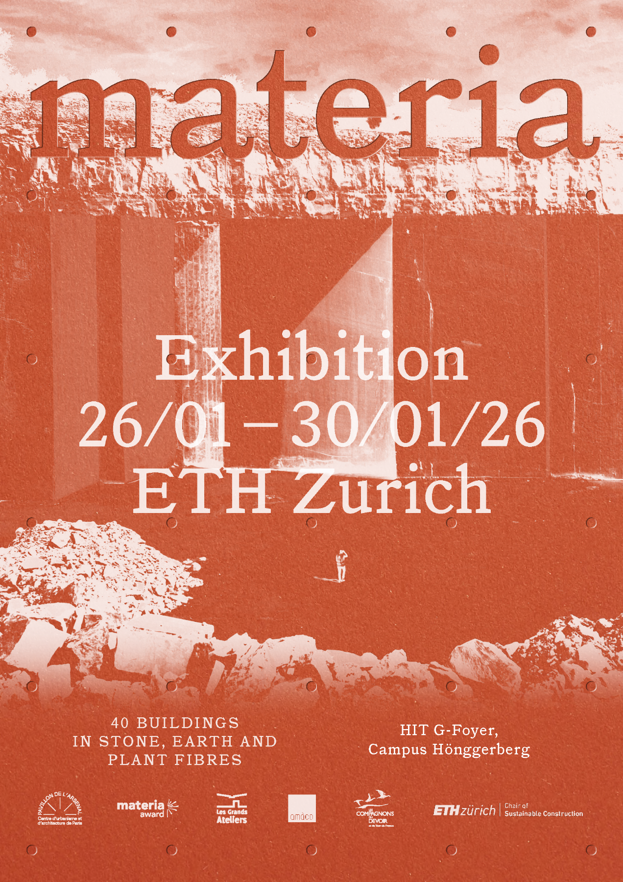 Materia Architectures combines stone, earth, and plant fibers and focuses on the rehabilitation of our existing built landscape. This exhibition documents and analyzes the architectural, technical, and ecological characteristics of the 40 finalist projects for the materia award. It has already been presented in Paris, Marseille, Valence, Bordeaux, Le Mans, Strasbourg, Clermont-Ferrand, as well as in Brussels, Lausanne, and even Beijing (further exhibitions will follow in 2026).