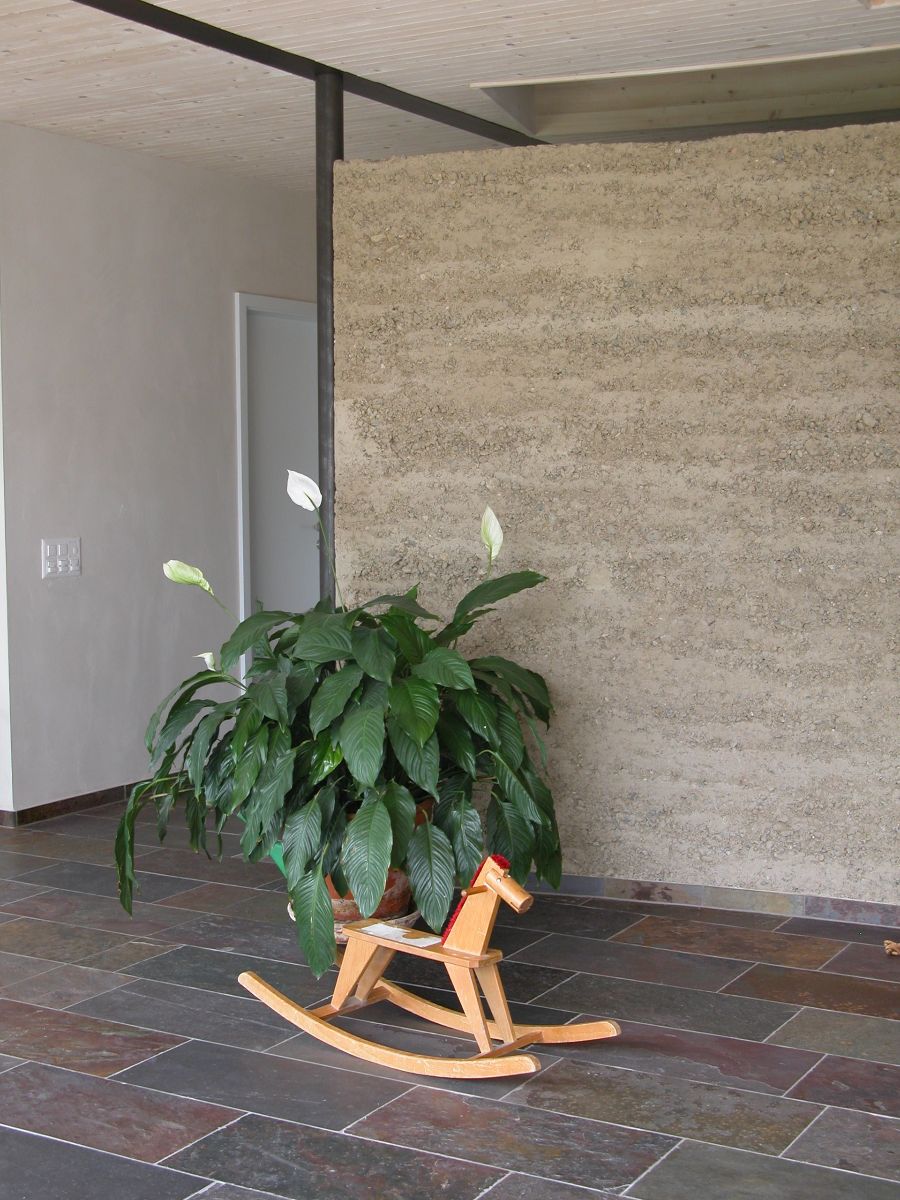 Niedrigenergiebauweise, Stampflehspeicherwand, Lehmspeicherofen, vorfabrizierter Holzrahmenbau