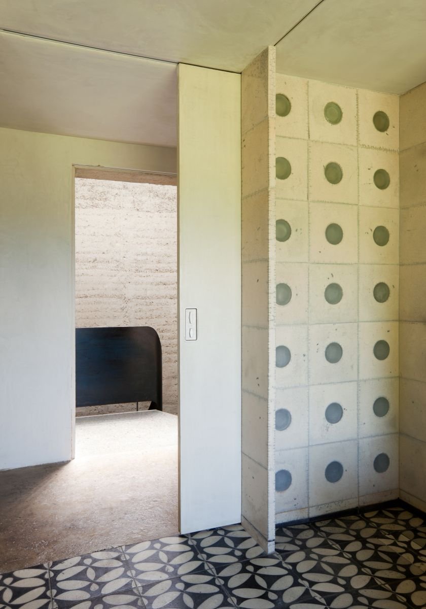 Im Gegensatz zu organischeren, archaischen Lehmarchitekturen verfolgt die Gebäudegestalt eine gewisse Klarheit und Scharfkantigkeit. Die zwischen den typischen Lehmschichten eingefügten Lagen aus Ziegelleisten stabilisieren den Baukörper optisch, indem sie die Horizontalität betonen und die Licht- und Schattenwirkung der Oberflächentextur verstärken. Auf der stofflich-atmosphärischen Ebene schafft die Raumfolge einen Verlauf, der durch eine austarierte Überlagerung unterschiedlicher Bearbeitungsstufen vom Rohen-Archaischen zum Vornehm-Prächtigen buchstäblich aufsteigt. Insgesamt ist das Wohnhaus ein laborartiges Experiment, welches ein Abbild ist von der engen planerischen Zusammenarbeit zwischen dem Architekten und dem Lehmbaumeister und Bauherrn Martin Rauch und in dessen eigenhändiger Erstellung des Baus gipfelt.